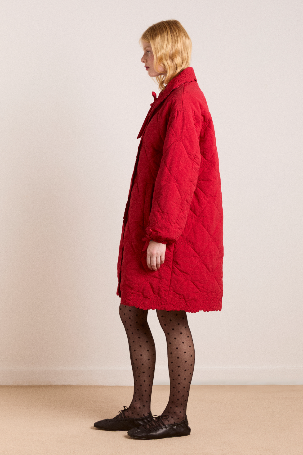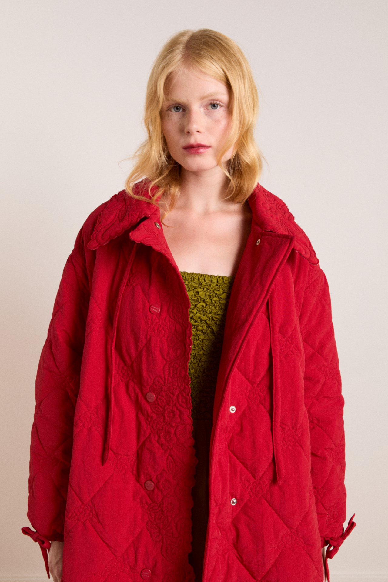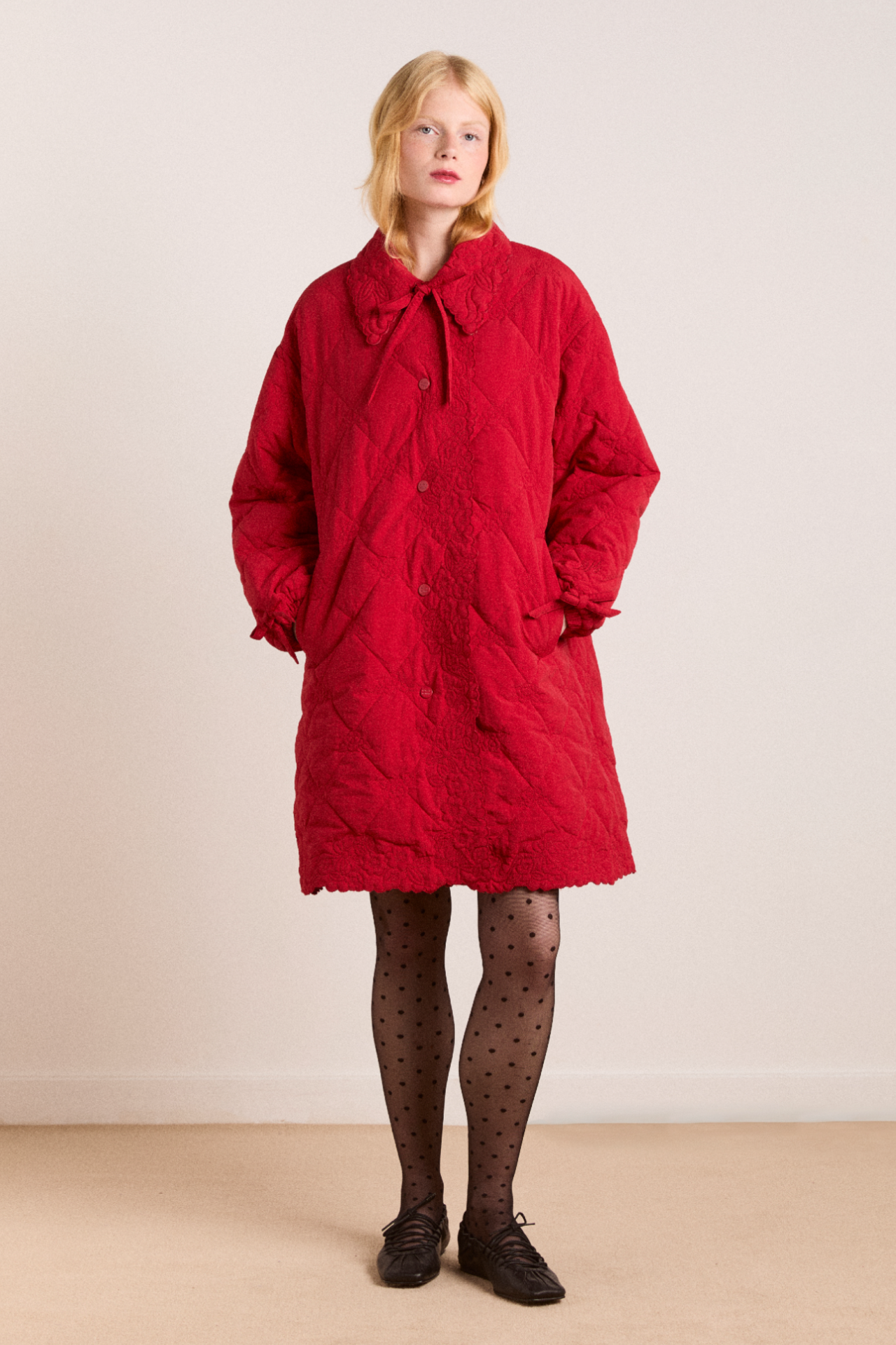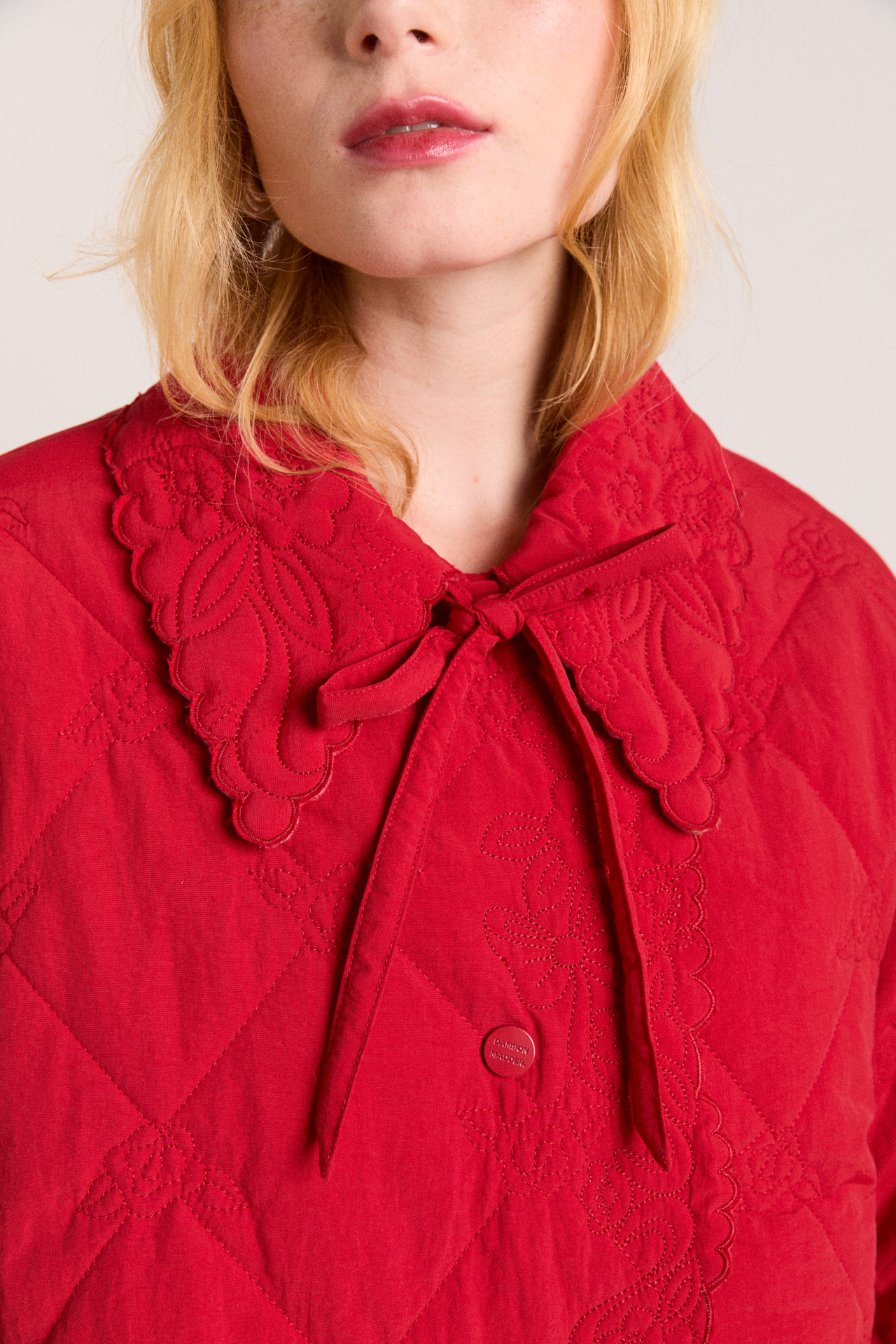 • Embroidered trim collar with bow fastening