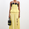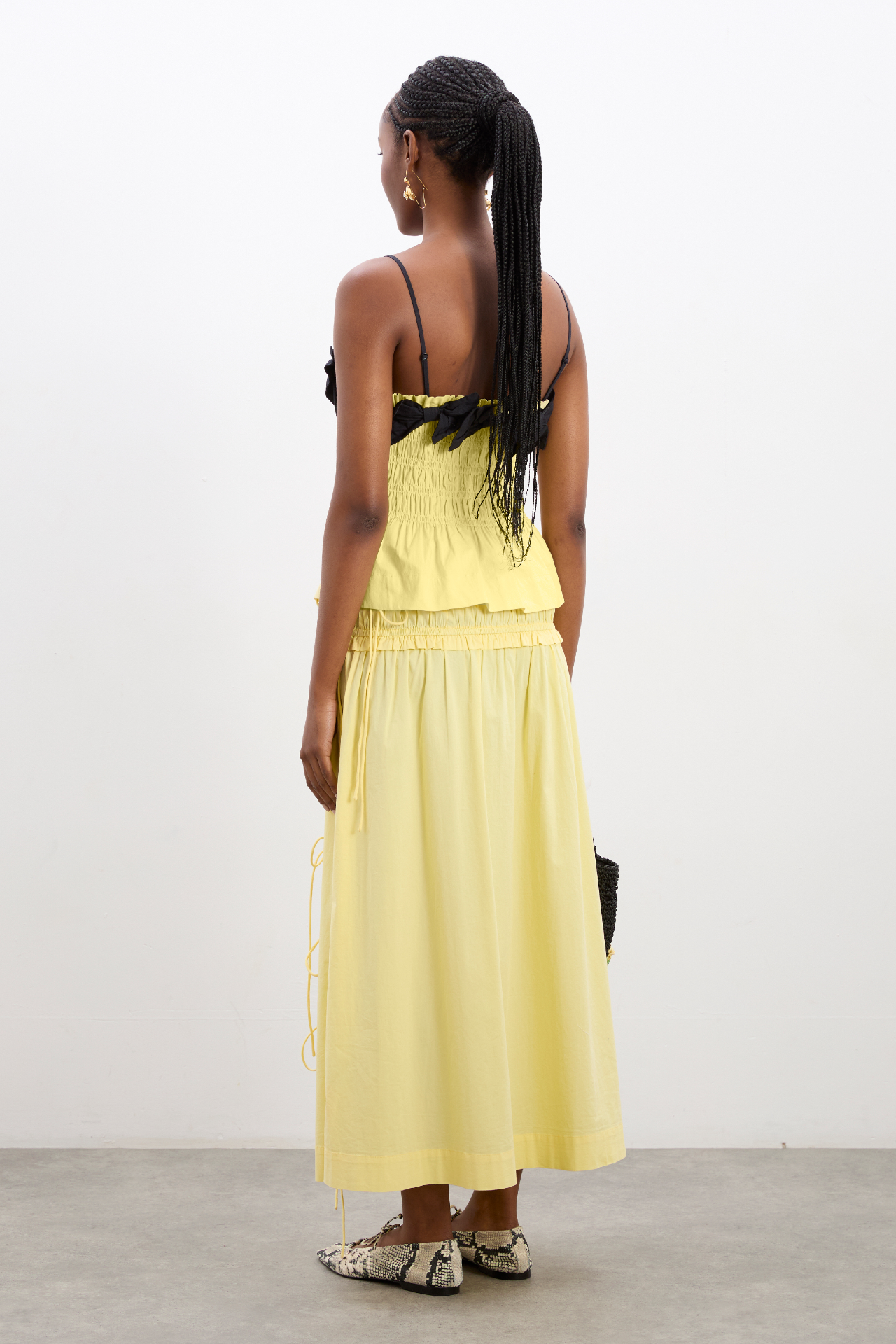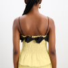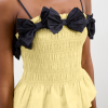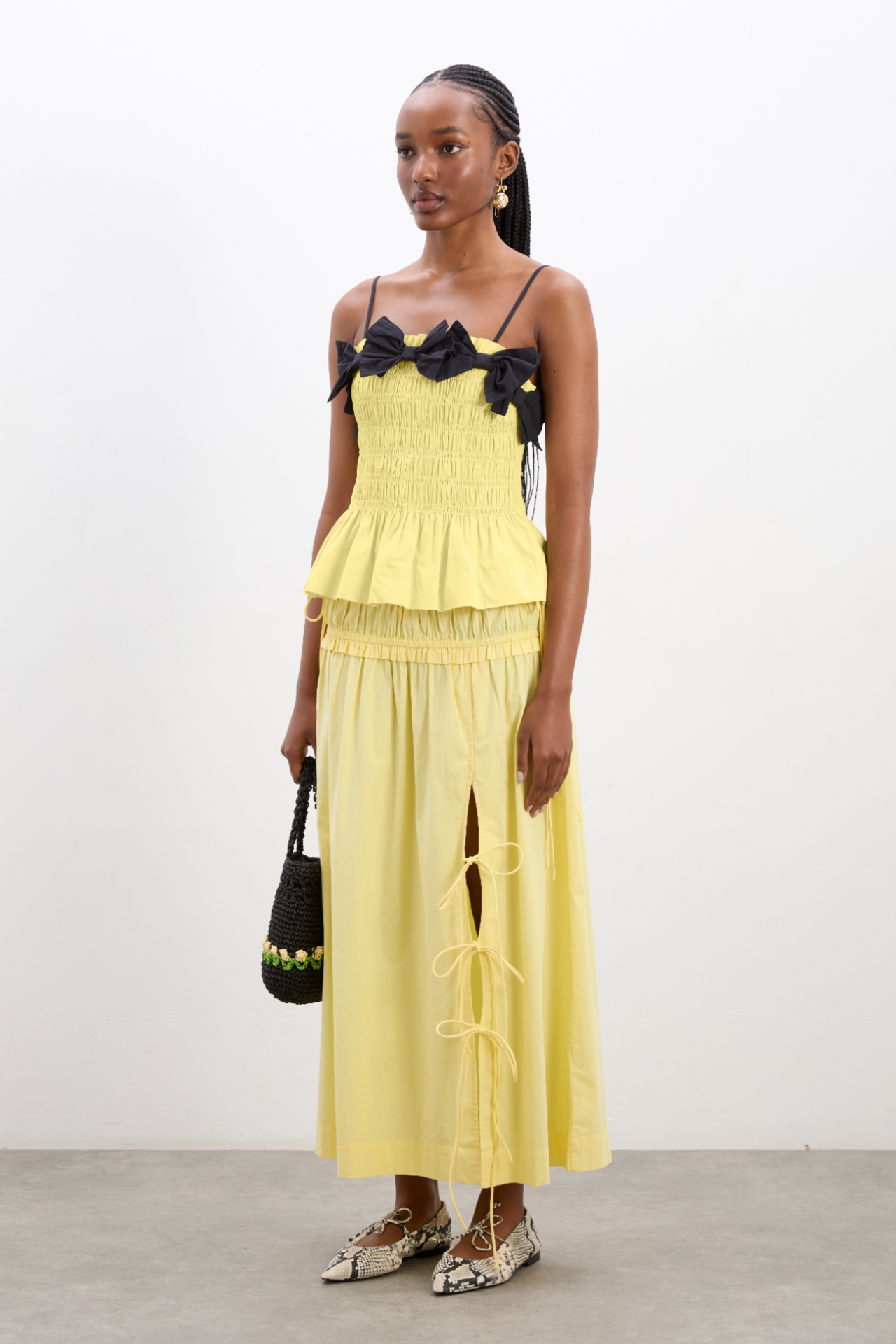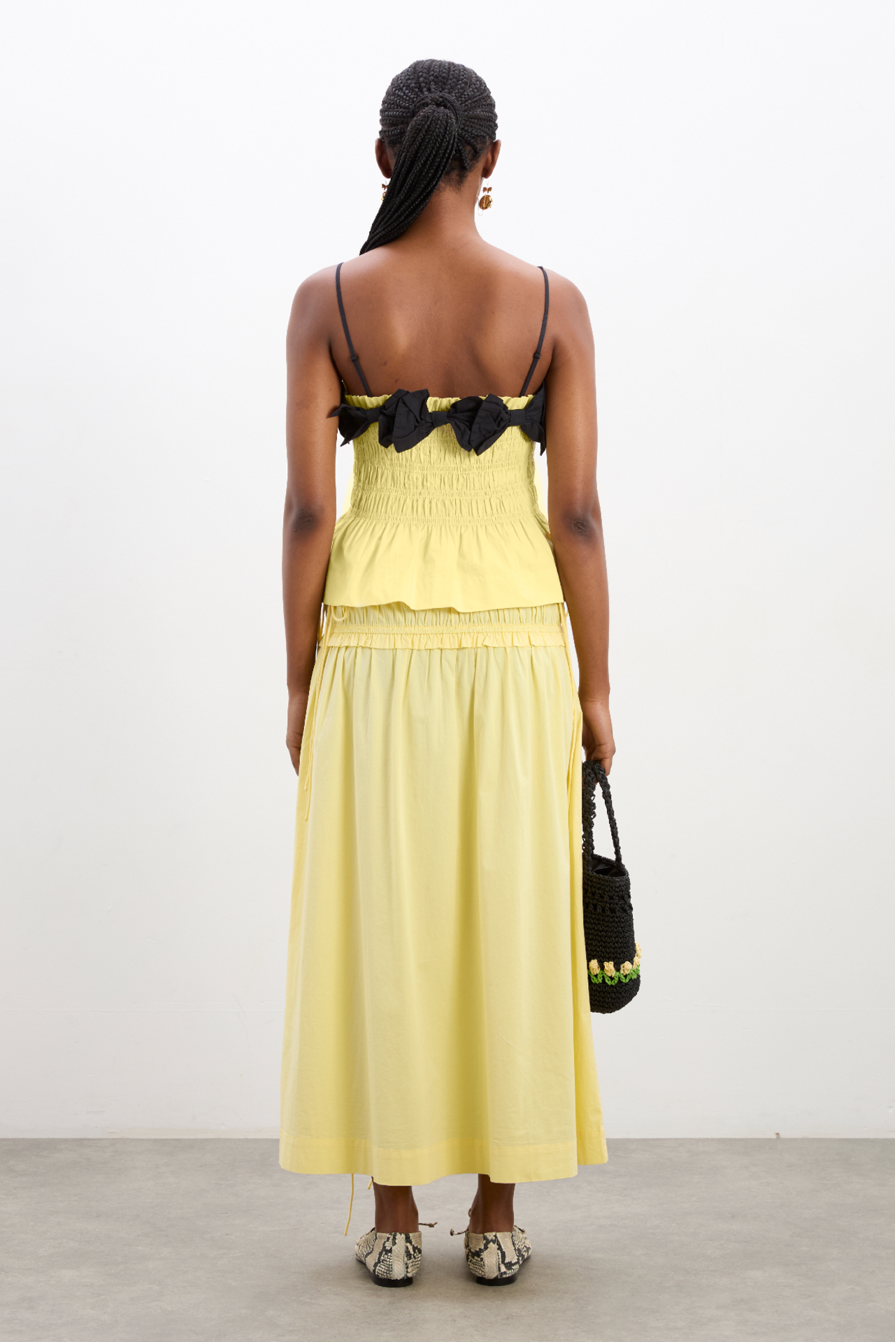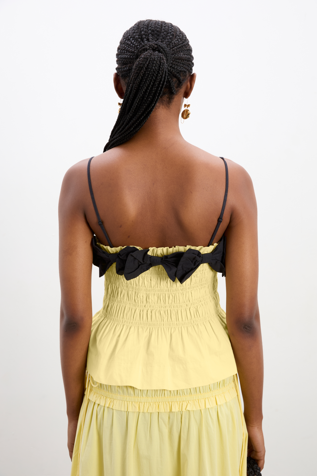 Crafted from organic cotton, the Bea Cami features a peplum hem and contrast bows at the bust, adding dimension to its clean, structured silhouette. With a stretchy shirred bodice and removable straps, this Bea is comfortable and versatile. Pair with our matching Charlotte Midi Skirt.