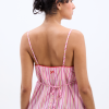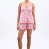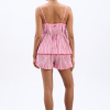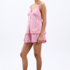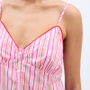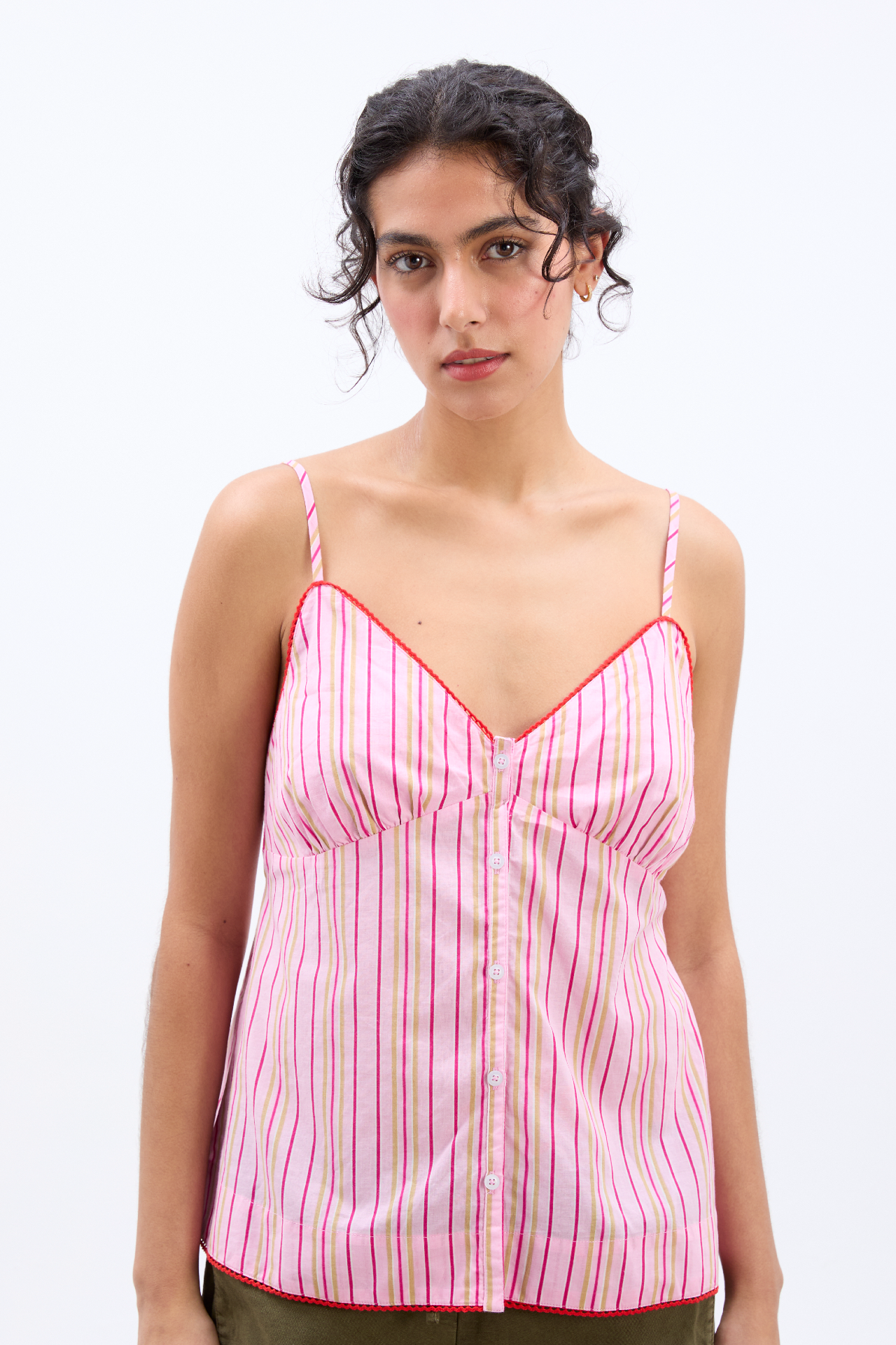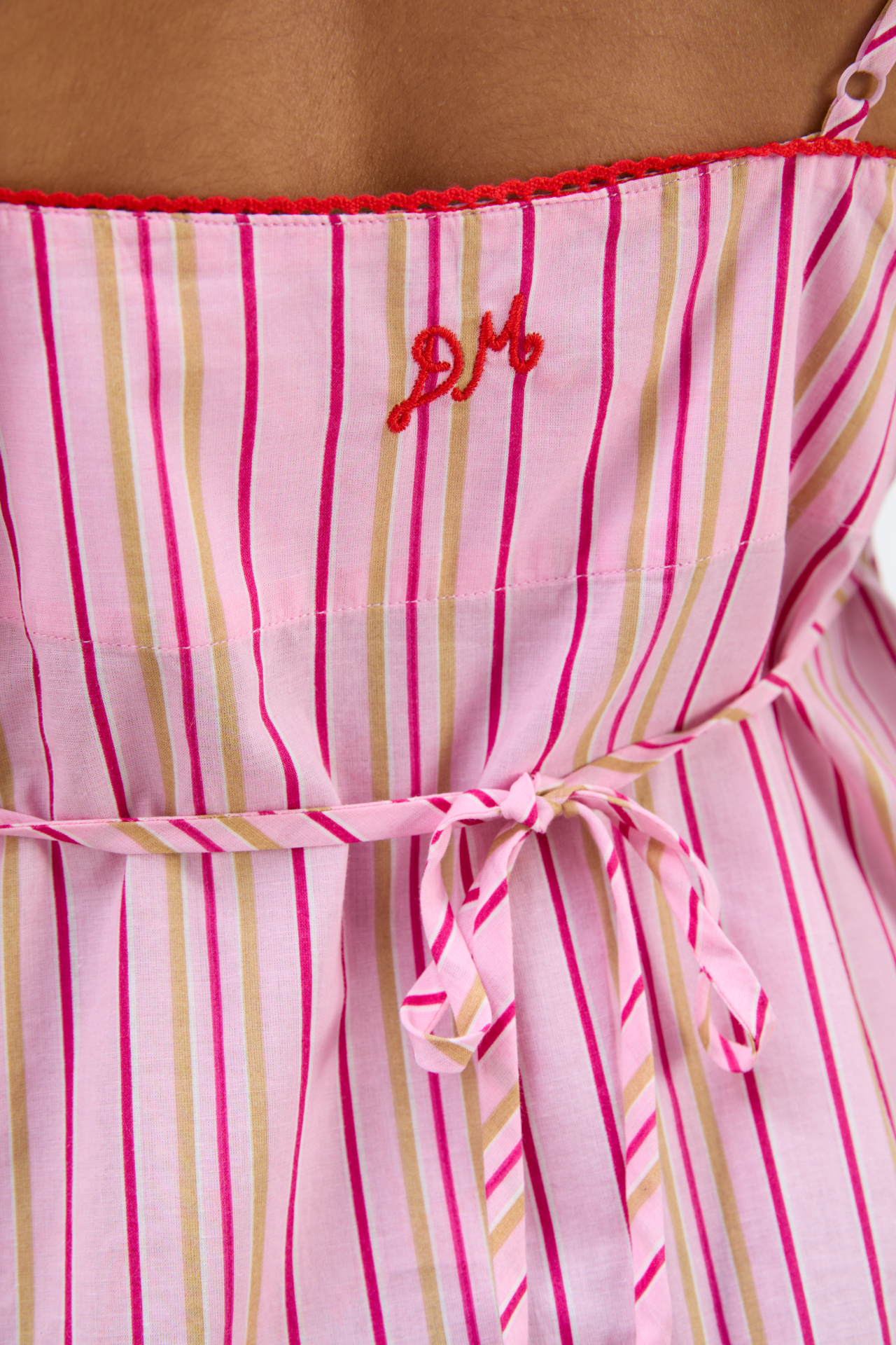 A dreamy staple that works from night to day, the Cosima Strappy Cami in pink stripe is crafted from breathable 100% organic cotton. Designed with adjustable straps, a button-down front, and a delicate contrast red trim, it’s finished with a tie waist for an adjustable fit. Pair with the matching Cosima Frilly Shorts to complete the look.