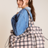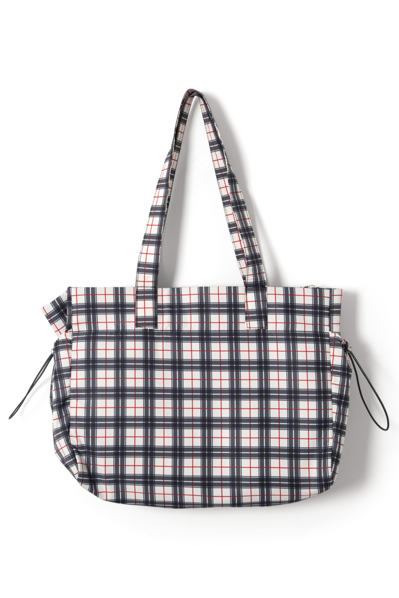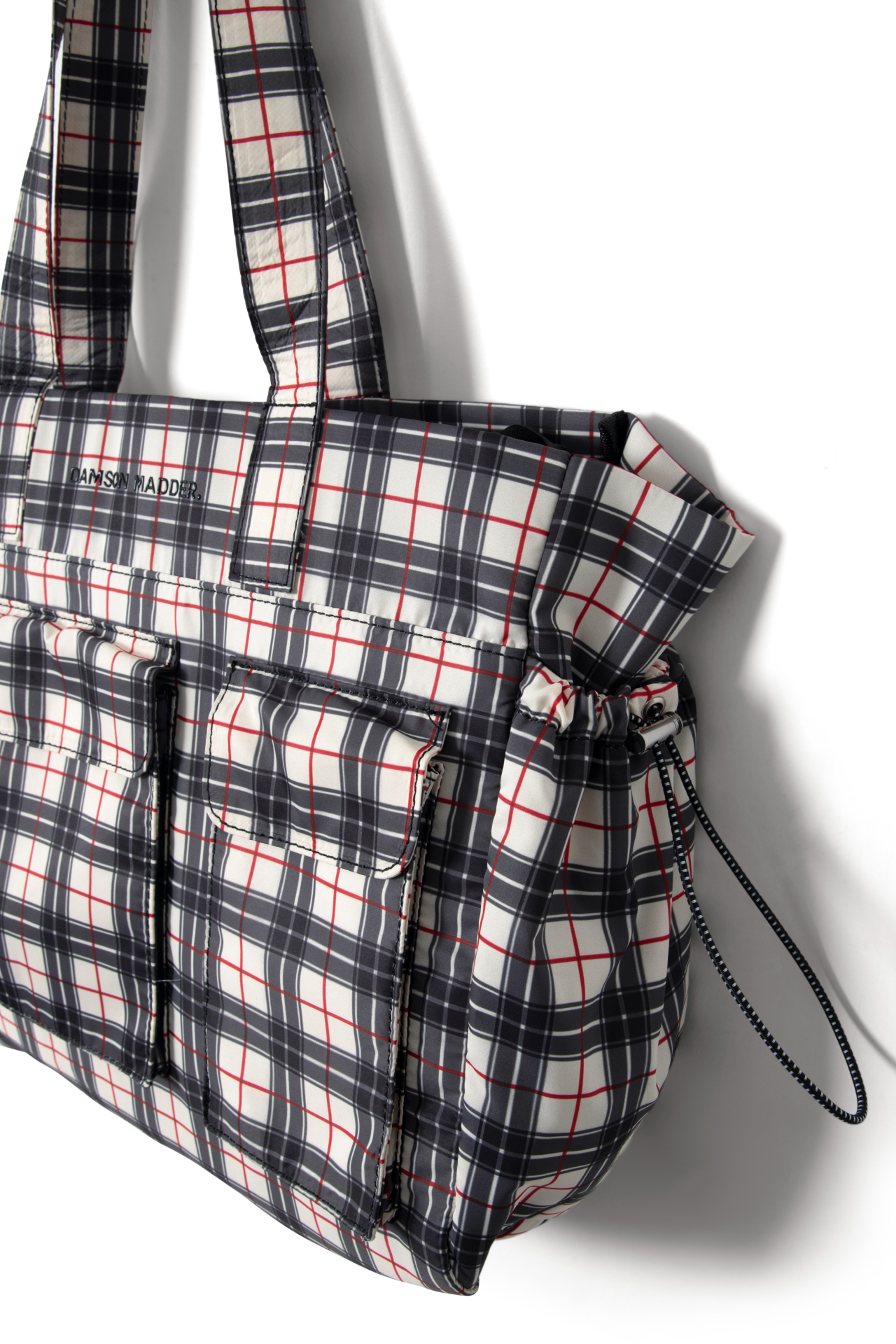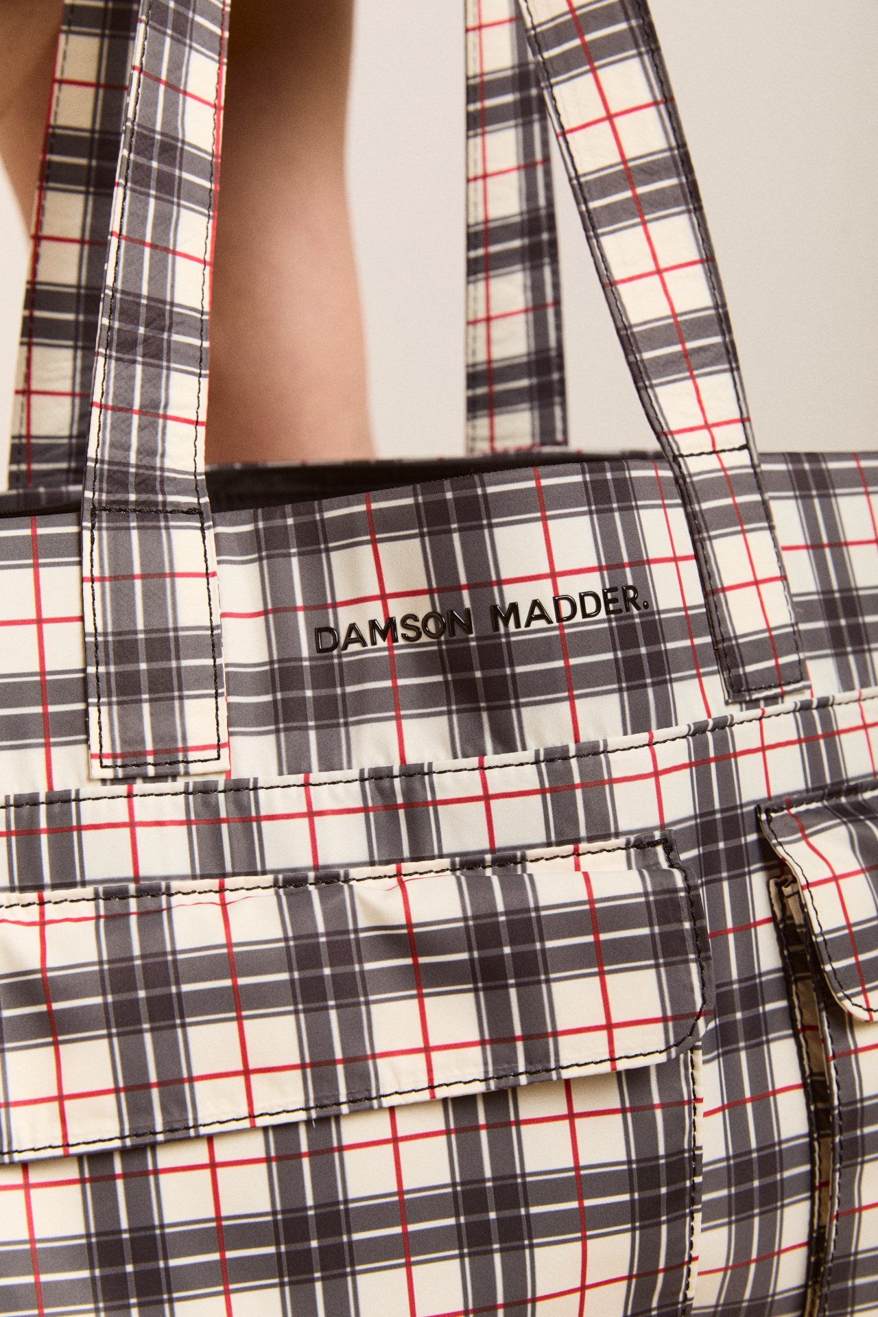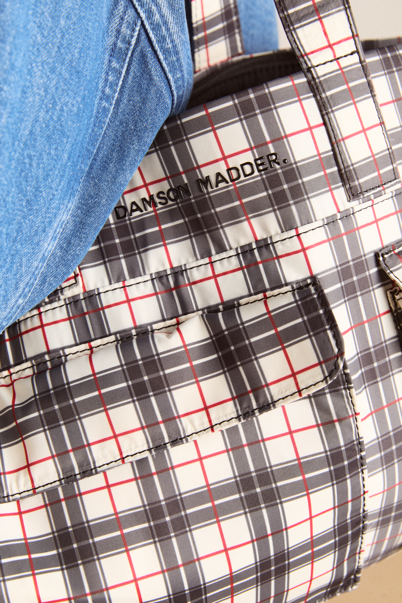 An elevated take on our signature DM tote bags, meet the Eliza Bag in butter check. This tote keeps all of your essentials secure and organised with its external front pockets and side toggle pockets, as well as an internal pocket and metal zipper closure to keep your valuables safe. Finished with an all over check print and rubberised Damson Madder branding, it is the ultimate statement everyday bag.