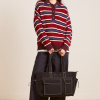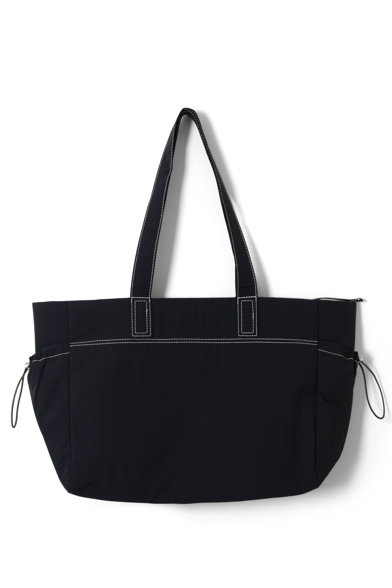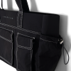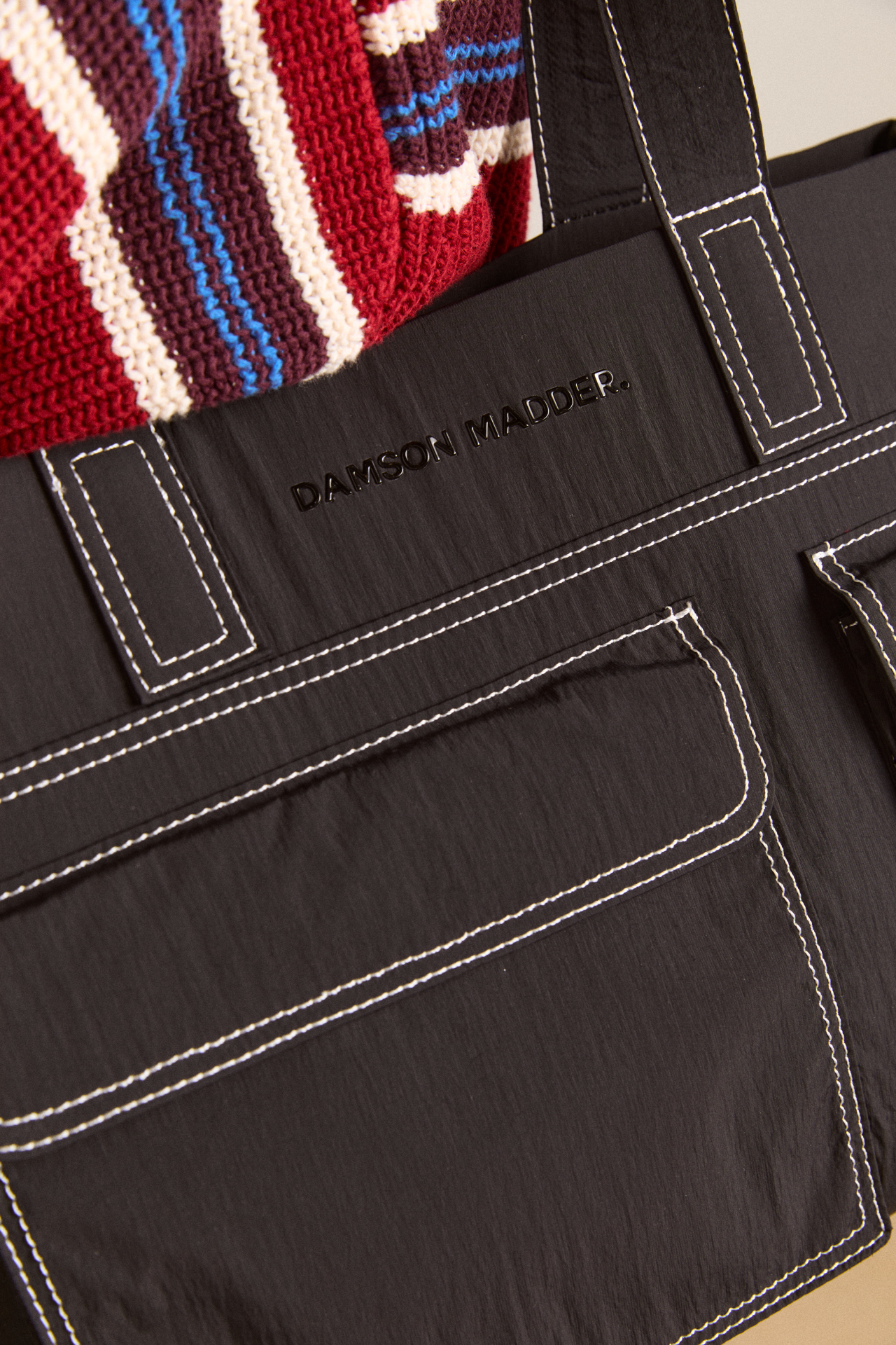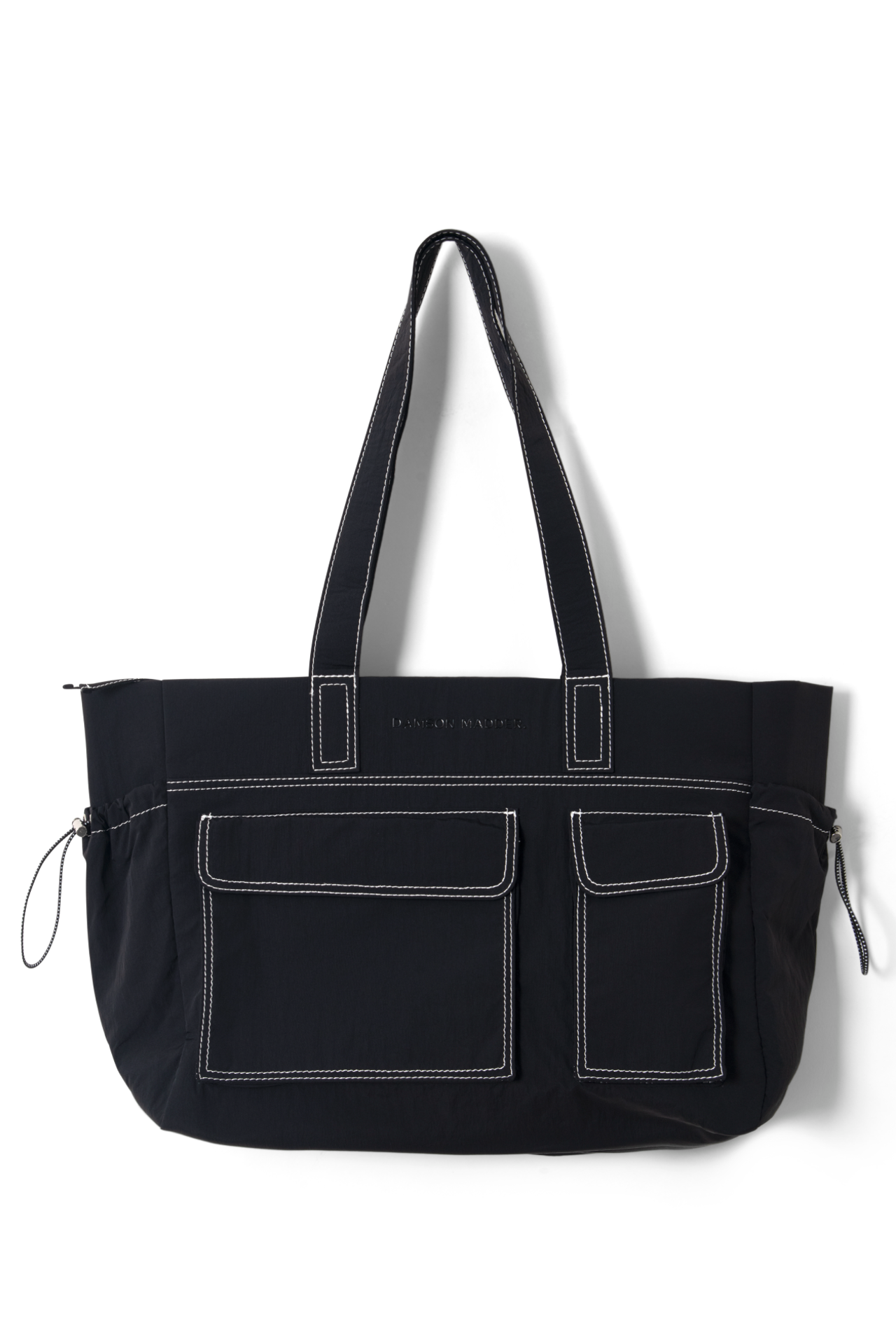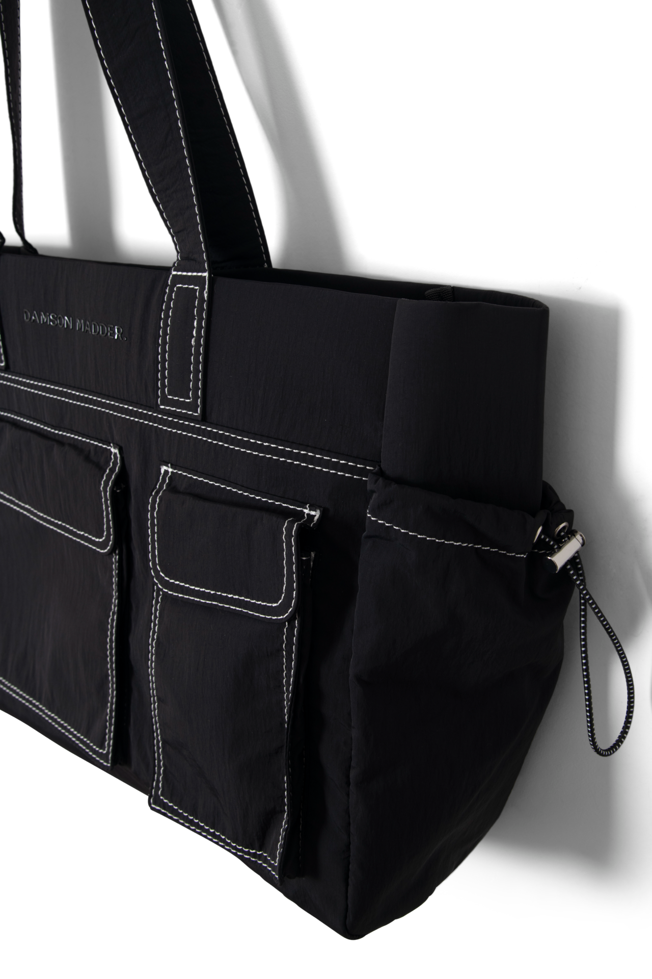 An elevated take on our signature DM tote bags, meet the Eliza Techy Tote Bag in black. This tote keeps all of your essentials secure and organised with its external front pockets and side toggle pockets, as well as an internal pocket and metal zipper closure to keep your valuables safe. Finished with white contrast stitching and rubberised Damson Madder branding, it is the ultimate everyday bag.