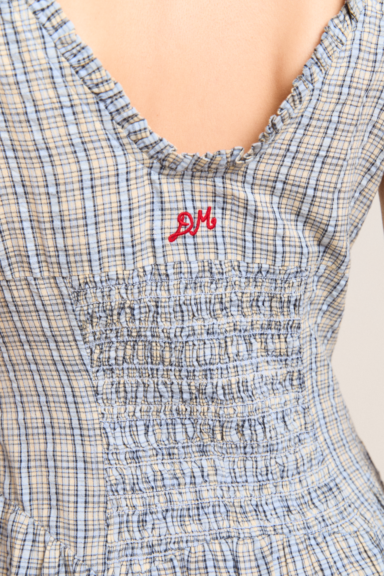 Meet the Mallory Midi Dress in cloudy check. Crafted from 100% organic cotton, it features a hand sewn smocked bodice, low back and a flowy drop waist skirt. The perfect balance of structure and softness, this dress will be on repeat season after season. Matching accessories available.