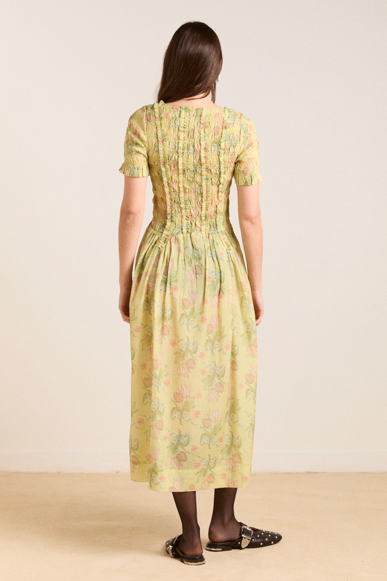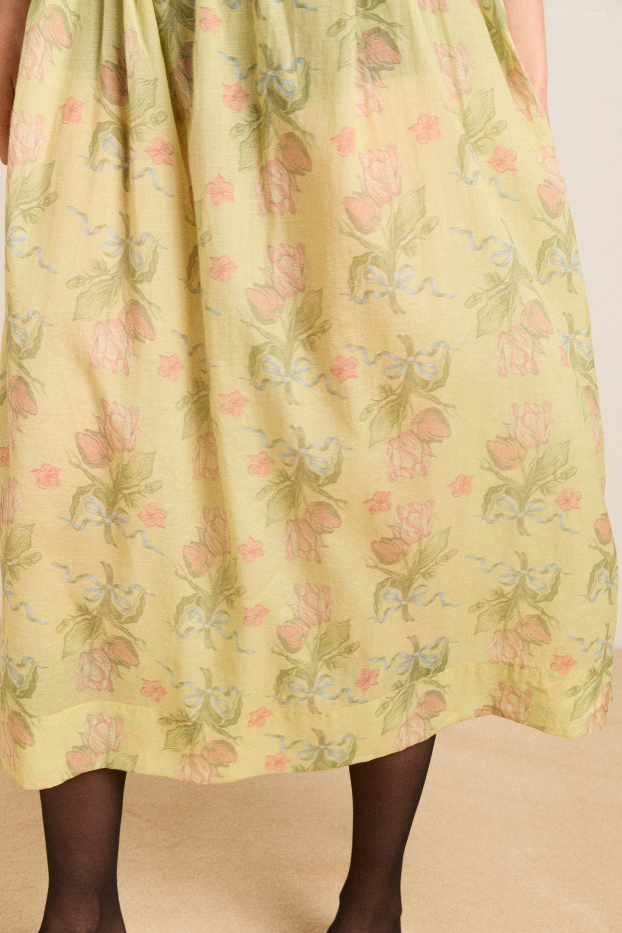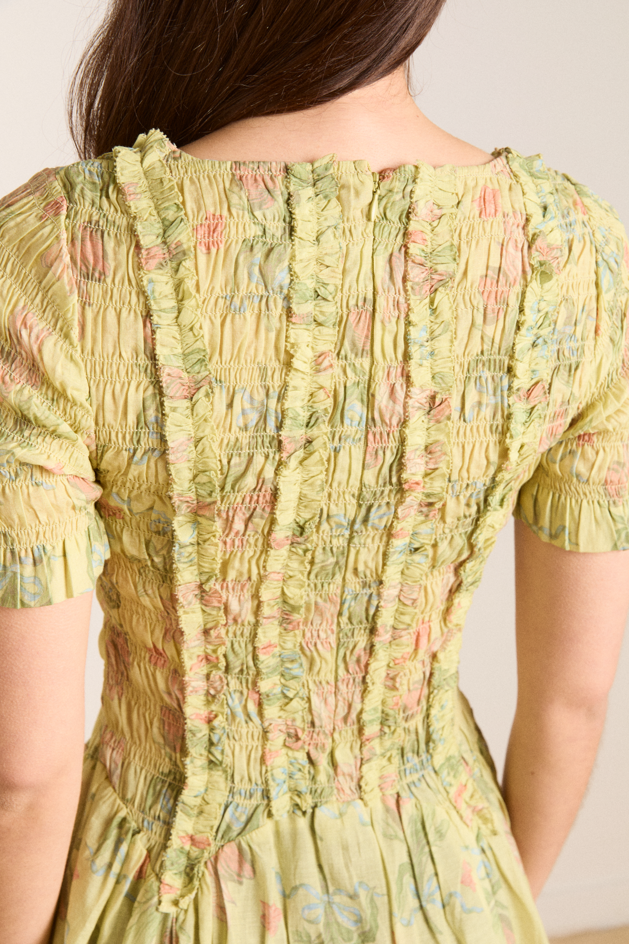 Vintage-inspired and effortlessly feminine, the Raphaela Ruffle Midi Dress in sheer tulip olive is adorned with an all over floral print and ruffle detailing. Designed with a square neck and shirred bodice for a flattering fit, with a flowy skirt delivering a timeless elegance.