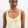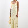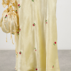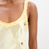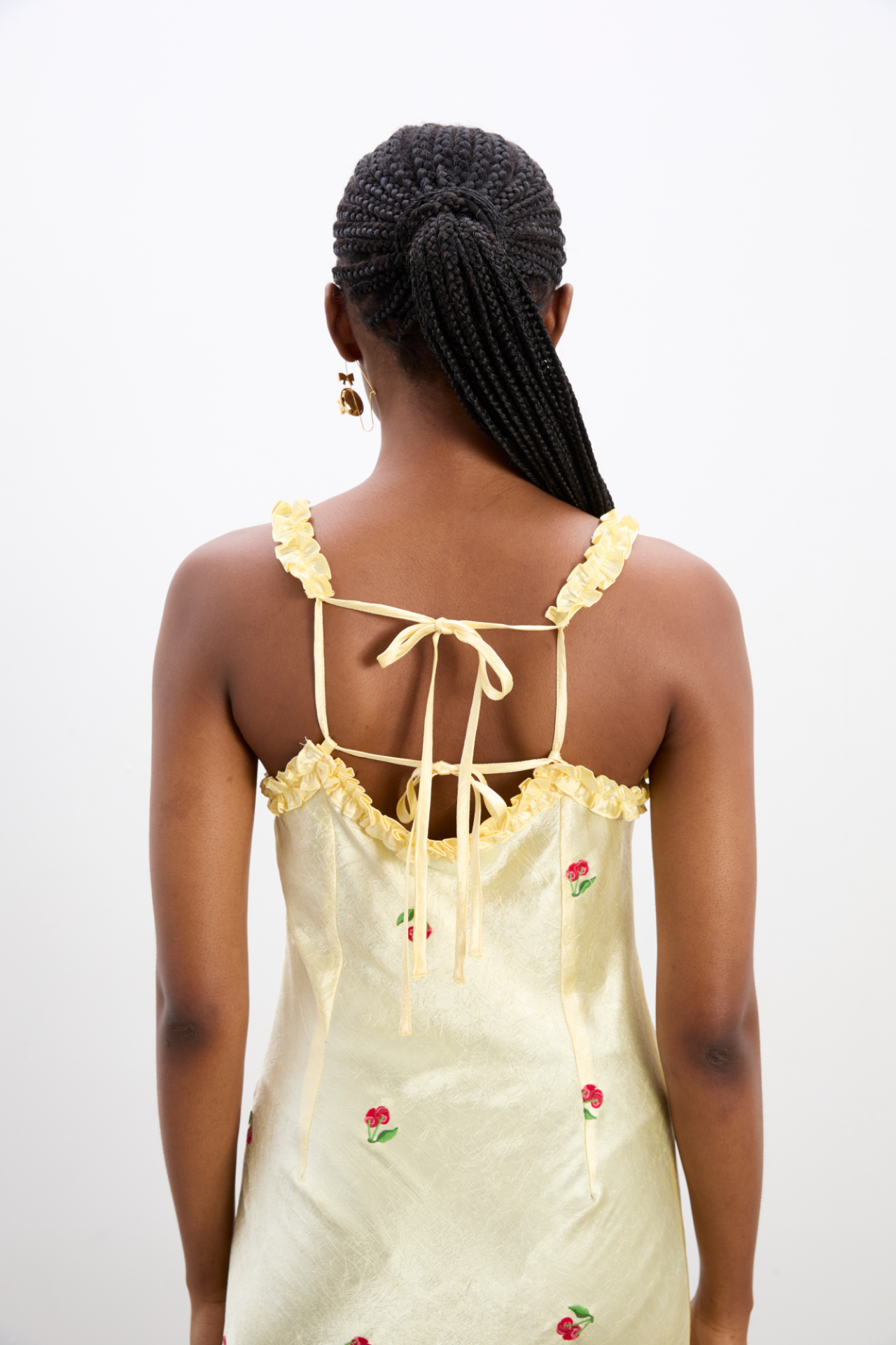 The Simone Slip Dress in butter yellow combines an all over cherry embroidery design with a beautifully draped bias-cut recycled fabric. Complete with ruffle detailing at the neckline and adjustable straps, this is the perfect dress for an evening event or formal occasion. Pair with our matching Simone Satin Scrunchie Bag. Due to the delicate nature of this garment, snagging can occur. Take care when wearing