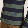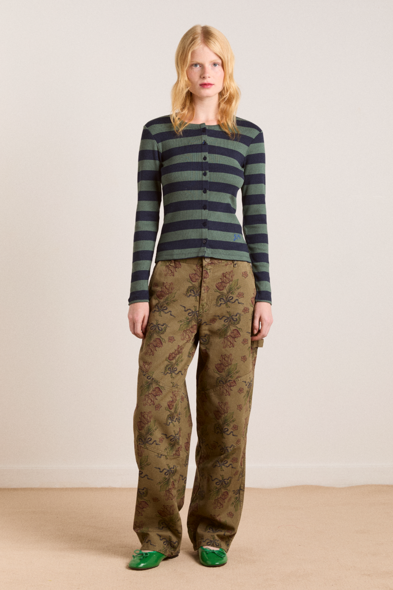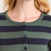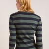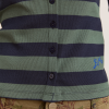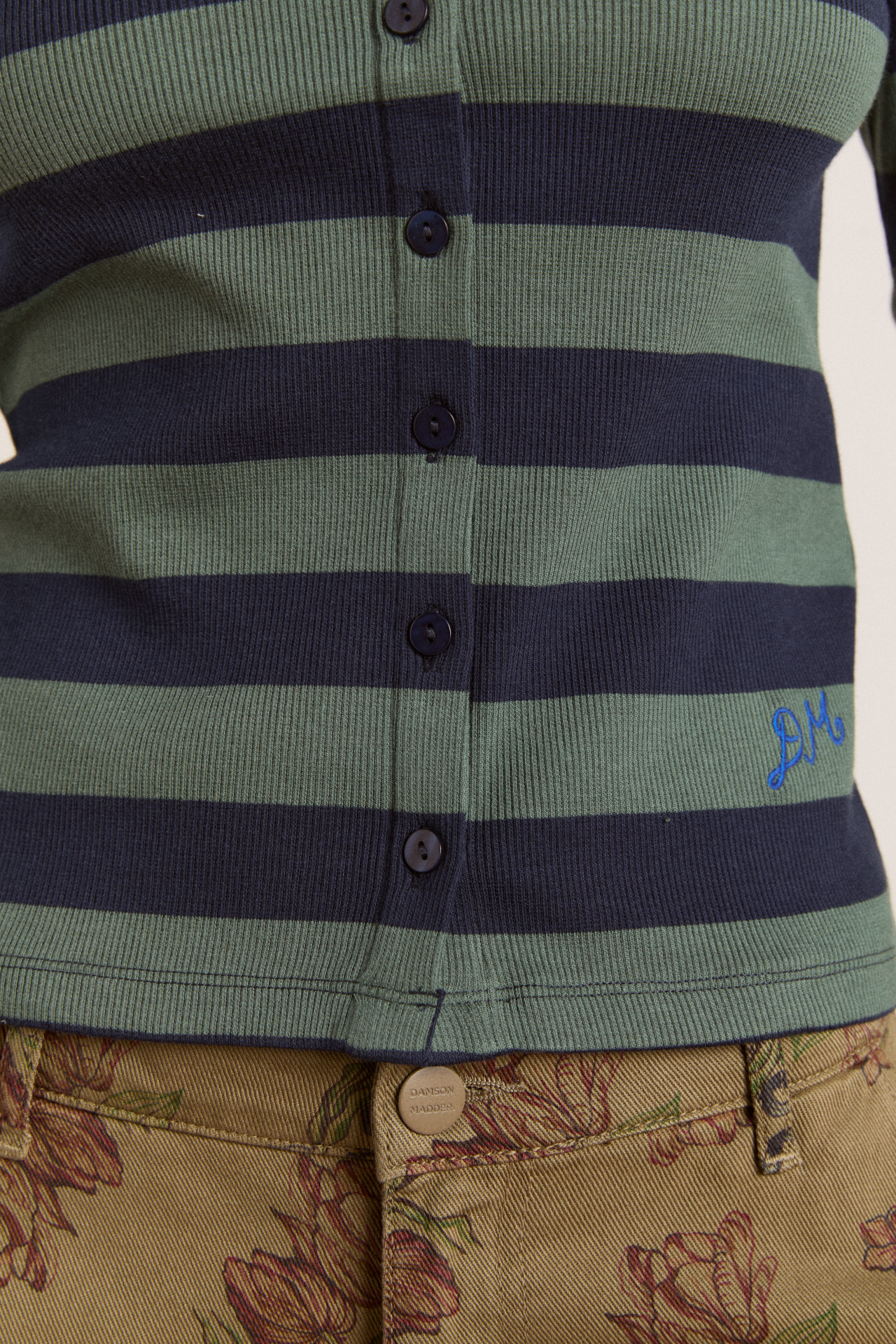 The Sybil Stripe Crew Cardigan in green/navy stripe nails maximum impact with minimal effort. Crafted from organic cotton, this crew neck cardigan features an all over stripe and button down front, finished off with our signature DM embroidery in blue.