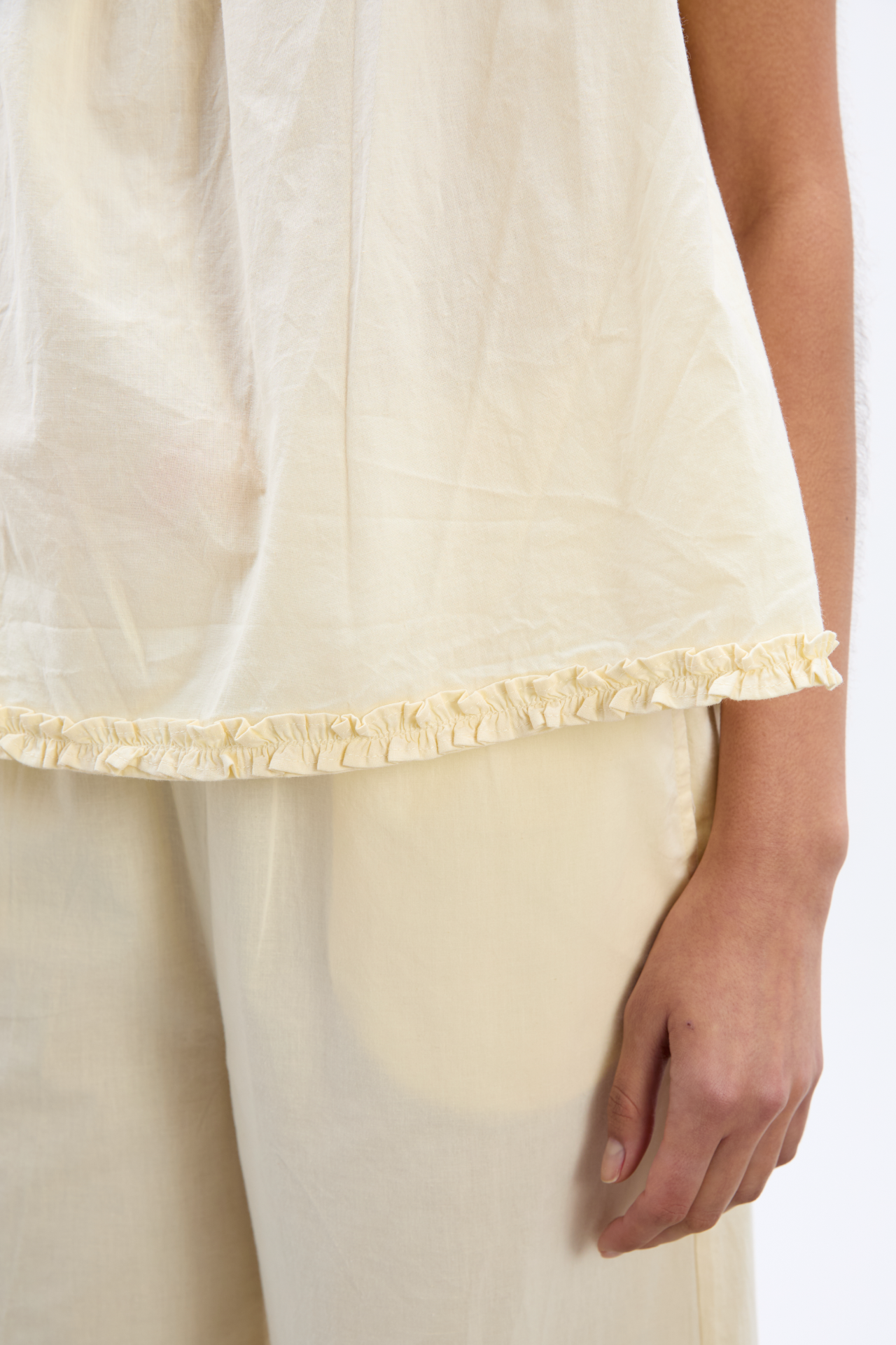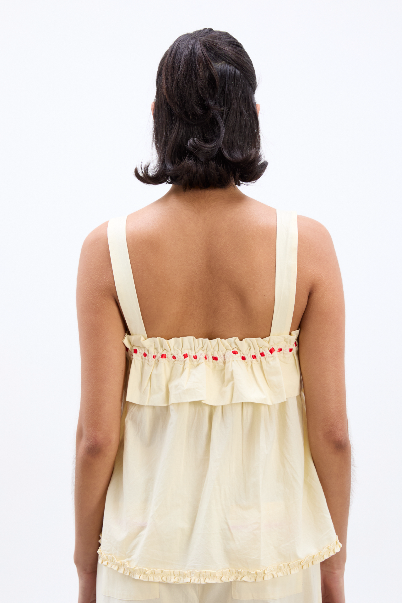 Soft and airy, the Tula Wide Strap Smock Cami is crafted from 100% organic cotton in a relaxed smock shape. Designed with a ruffle neckline, contrast tie at the neck, and delicate ruffle hem detailing, this true-to-size cami pairs effortlessly with the matching Tula Frilly Hem Trousers.